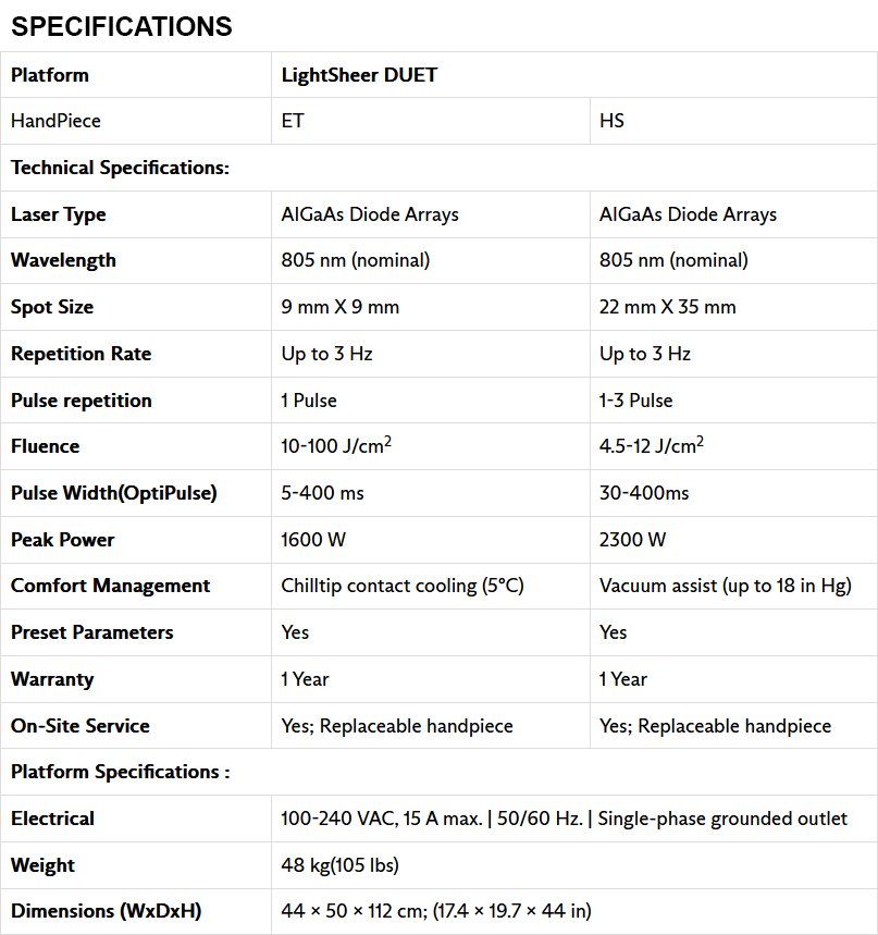 The LightSheer DUET includes two optimal wavelength 800 nm diode hair removal systems on one versatile platform.